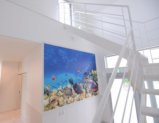 玄関ホールにアクセントクロスで沖縄の海を表現しています。