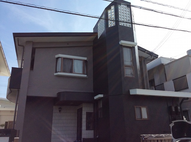 築20年、紫外線等でダメージを受けた外壁をシリコン塗装、屋上防水(遮熱)、クラック処理を致しました。外壁のカラーは、思い切って違うイメージにしたいと言う、奥様の希望でベースをモカブラウンし、ダークブラウンとホワイトをアクセントに塗装いたしました。いい感じに仕上がり、奥様にも大変気に入っていただきました。